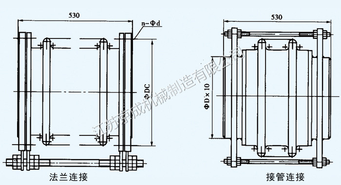 2、表中符號代表和技術(shù)參數(shù):△X:軸向補(bǔ)償量(mm); △θ:角向補(bǔ)償量(度); △Y:橫向補(bǔ)償量(mm);KX:軸向剛度(N/mm); Ky:橫向剛度(N/mm); L:產(chǎn)品總長(mm);ΦDx10:接管外徑x接管厚度(表中mm),產(chǎn)品為接管連接;ΦDc:連接孔分布的中心圓直徑; n-Φd:n為連接孔數(shù),Φd為連接孔徑,產(chǎn)品為法蘭連接;